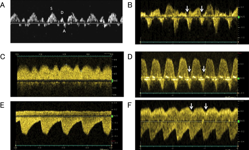 先に述べたように,胎児循環では左右どちらの心機能が低下した場合でも中心静脈圧の上昇を来す.心室に拡張障害を来した場合,心房機能が保持されている間は心房収縮が亢進して心室への流入を補うため,心房収縮時の心房圧(中心静脈圧)が上昇する.成人において左室拡張障害時に肺静脈血流波形のA波が増高して持続時間が延長するのと同様に,胎児でも中心静脈圧の上昇を反映して静脈系の血流パターンに変化が起きる(Fig. 1).主に計測されるのは心房に近い部位から,下大静脈,静脈管,臍帯静脈の血流で,心房からの距離が遠い部位に行くほど重症になってから波形に影響がでる.