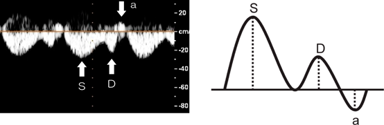 下大静脈血流はPreload Index(PLI)によって評価される.下大静脈では正常でも逆行性血流を認め,血流波形は収縮期順行性血流のS波,拡張期順行性血流のD波,拡張期逆行性血流のa波と呼称されるが,PLIはa/S比として算出される3)(Fig. 2).中心静脈圧が上昇するとa波の流速が速くなり,PLIは中心静脈圧の上昇を反映して上昇する.正常値は在胎週数が進むに従って低下するが,妊娠後期では0.5以上は異常と考えられる1, 4).