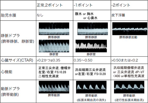 CVPSは心機能・循環不全の指標5項目(胎児水腫の有無,臍帯静脈・静脈管のドプラ波形,CTAR,心機能(FS,房室弁流入波形パターン),臍帯動脈ドプラ波形)を合わせてスコア化したもので,合計10点から各項目それぞれ0~2点を減点してスコアを算出する(Fig. 3).