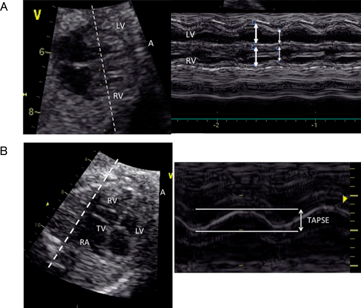なお,出生後の心エコーではTAPSEはセクタプローブを使用して心尖部四腔断面において三尖弁輪にカーソルを置いて計測するため,心室中隔には平行ではなく厳密には計測の方向が異なっている.