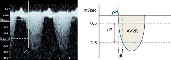 dP/dtは,心室内圧の時間変化曲線の一次微分関数(傾き)で,その最大値max dP/dtは通常は等容収縮期に得られ,後負荷の影響を受けにくい心室収縮機能の指標となる9).心室収縮機能が良好であれば心室圧は急速に上昇するため高値となる.心エコーでは,これを房室弁逆流の連続波ドプラ波形の立ち上がり速度の時間変化から簡易ベルヌーイ式を基に算出し,収縮機能の指標の一つとしている.出生後の心エコーでは房室弁逆流血流速度が1→3 m/sまで上昇するのにかかる時間から算出されるが,胎児心エコーでは,房室弁逆流血流速度が0.5→2.5 m/sまで上昇するのにかかる時間をdtとし,dPは簡易ベルヌーイ式を用いて(2.5)2×4−(0.5)2×4=24 mmHgであるので,そこからdP/dtを算出する(Fig. 5).800 mmHg/sec以下は低値で,400 mmHg/sec以下は重度の収縮機能低下と考えられる5).なお,dP/dtは最大値が心室収縮機能の指標となるが,胎児では心室圧が低いため,2.5 m/sでも血流波形のピークに近く,流速の増加率が低下している部分にあたる場合には正確な収縮機能を反映しない結果が算出されてしまうため,1→2 m/sで計測するなどの工夫が必要であるが,計測の誤差が大きくなる可能性がある.