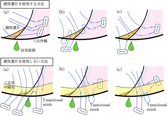 膜性翼片を使用する方法:(a)1針目は膜性翼片に運針し,2針目は欠損孔辺縁から2 mm以上離して運針する.(b)膜性翼片にプレジェットを置く方法.(c)三尖弁中隔尖側と中隔側からそれぞれ膜性翼片に運針する. 膜性翼片を使用しない方法:(a)房室結節近傍は弁輪から3 mm以上離れた三尖弁中隔尖に運針する.房室結節から十分離れた位置で,三尖弁輪から刺入し心室中隔に刺出する.(b)房室結節から十分離れた位置で,三尖弁輪にtransitional stitchを置く方法.(c)心室中隔から刺入し,欠損孔辺縁から十分離れた位置で刺出.三尖弁中隔尖にtransitional stichを置く方法. 緑点線:穿通束,水色点線:Non-penetrating, non-branching bandle