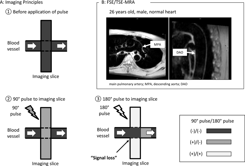 FSE法/TSE法は,高速度信号損失(high velocity signal loss)を利用したflow dependent MRAである2, 3).FSE法/TSE法では90°と180°のラジオ波パルスを使用する(Fig. 1A).撮影断面内にある静止したプロトンは,両方のラジオ波パルスを受けることにより高信号となる.一方,撮影断面を速い速度で直行するプロトン(=血流)は,90°と180°のラジオ波パルスの両者を受けることなく撮影断面から出ていってしまうため(wash out),低信号に描出される(高速度信号損失)3, 4)