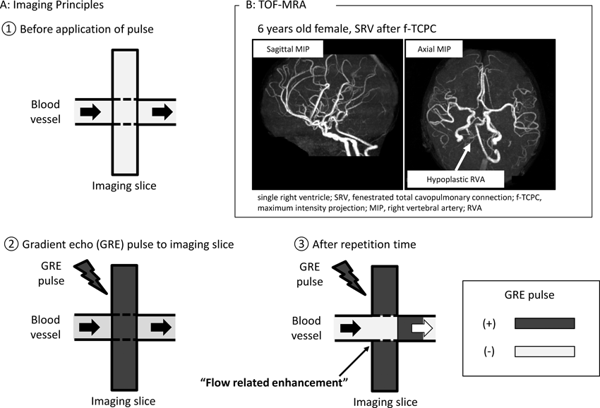 TOF法は,流速関連増強(flow-related enhancement)を利用したflow dependent MRAである1–3).TOF法は,複数回のラジオ波パルスを使用するグラジエントエコー(gradient echo: GRE)法で撮影する(Fig. 2A3).撮影範囲内にある静止したプロトンは,複数回のラジオ波パルスを受けることで磁化が飽和し,定常状態に達して低信号となる.一方,撮影範囲外から流入するプロトン(=血流)は,複数回のラジオ波パルスを受けることなく磁化が不飽和な状態(十分な縦磁化を有している状態)であるため高信号に描出される(流速関連増強)2, 3).なお,動静脈が併走しているような場合には両者とも高信号に描出される.動脈のみを描出したい場合は,静脈が撮影範囲内に流入する前の部位で前飽和パルスをかけると,静脈内は低信号となり動脈が高信号に描出される9)