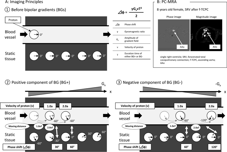 PC法は,スピン位相効果(spin-phase effect)を利用したflow dependent MRAである1–3).スピン位相効果とは,磁場勾配が存在するなかで磁場勾配の方向にプロトン(=スピン)が流れたとき,位相の変化(位相シフト)が起こる現象である.位相シフト(Δφ)はプロトン(=血流)速度(v)・傾斜磁場強度(Gx)・傾斜磁場印加時間(T)の2乗に比例するため3),GxとTとが設定されれば,vに応じたΔφが得られる.すなわち,Δφからvを求めることが可能となる.また,静止した組織ではスピン位相効果は起こらないため,静止した組織と血流との間にはΔφの大きさの位相差が生じる.この位相差を利用することで画像が得られる.