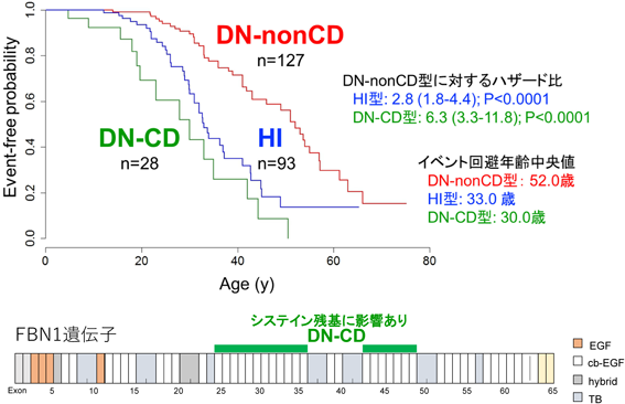 近年はFBN1遺伝子の表現型と遺伝子型の関係が明らかになり,患者の遺伝子変異を同定することでMarfan症候群における様々な症状の発症時期の予測が可能になってきた.例えば,蛋白質のジスルフィド結合に関与するシステイン残基における変異では水晶体偏位との関連が知られており,未熟終始コドンを生じて遺伝子産物の不足が起こる変異(ハプロ不全群)では大動脈病変の進行が報告されている4).一方で,当院では,従来遅発型と考えられていたミスセンス変異群(Dominant Negative群)の中にも,大動脈基部置換手術や大動脈解離などの大動脈イベント発生年齢が早い変異型を持つ一群(DN-CD群:エクソン25-36, 43-49内でのCysteine残基に関連したミスセンス変異またはエクソン欠損Deletion)を新たに見出した.Fig. 3に示すように,DN-CD群(28名)は,早発型であるハプロ不全群と同等(30.0[95%信頼区間:19.0–42.0]歳)に早期に血管イベントを発症していた5).また,側弯症の進行に関しても,ハプロ不全群やエクソン25-33のミスセンス変異が重症化のリスク因子になることが報告されている6).