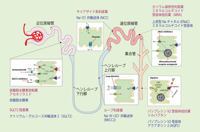 利尿薬にはループ利尿薬,サイアザイド系利尿薬,カリウム保持性利尿薬,ミネラルコルチコイド受容体拮抗薬,バソプレシンV2受容体拮抗薬,SGLT2阻害薬などの種類があり,それぞれ腎臓での作用部位が異なる(Fig. 3)16, 17).以下に各利尿薬を簡潔にまとめた.