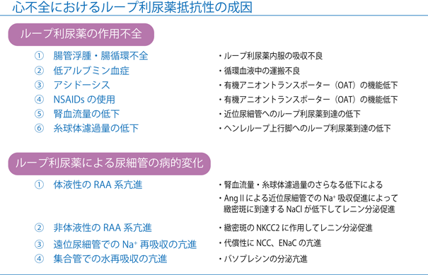 腸管からの吸収は心不全に伴う腸低還流・腸管浮腫の存在下では著しく障害される.ループ利尿薬の内服投与では十分に吸収されず利尿効果を発揮できない症例も多く経験する.心不全や低栄養による血清蛋白・アルブミン低下はループ利尿薬の運搬障害となり作用低下につながる.さらにアシドーシスや非ステロイド系抗炎症薬の使用はOATに影響して尿細管管腔に分泌されるループ利尿薬が減少して利尿薬抵抗性を招く.腎血流が低下すると近位尿細管周囲の毛細血管に到達できるループ利尿薬が低下する.また,糸球体濾過量が低下すると尿細管内の尿が減少してヘンレループに到達できるループ利尿薬が低下する.これらがループ利尿薬の作用障害による利尿薬抵抗性の代表的な例である.各機序を理解して適切に対応することでループ利尿薬の効果発揮につながると思われる.