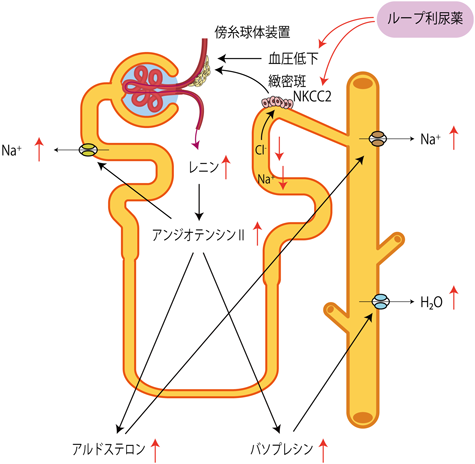ループ利尿薬によって尿細管およびレニン・アンジオテンシン・アルドステロン系の作用が影響(赤矢印の上下に作用するよう影響)され,利尿薬抵抗性を生じさせる.