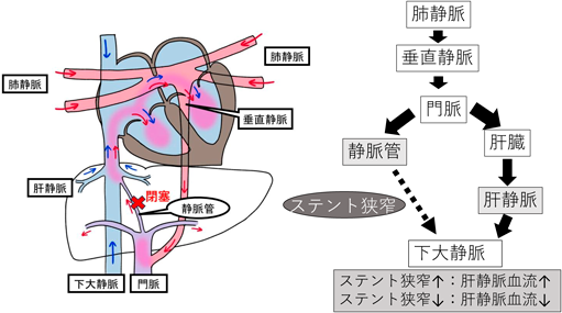 左右4本の肺静脈は共通腔を形成して垂直静脈につながる.垂直静脈は下大静脈に流入する静脈管と肝臓に流入する門脈に分かれる.静脈管に置かれたステントが狭窄すれば門脈→肝類洞→肝静脈→下大静脈の血流が増加する.一方でステント狭窄がない場合は肝静脈の血流増加はみられない.