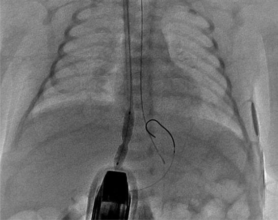 当院搬入時は気管挿管下で心拍数140回/分,血圧59/31 mmHg,呼吸数52回/分,SpO2 95%(O2 4 L/min)であり,入院時に呼吸状態安定を確認して抜管し,その後は経鼻的持続陽圧呼吸療法(FiO2 0.3)にてSpO2 93~95%で経過した.その後も陥没呼吸,多呼吸,低酸素血症SpO2 93~95%(FiO2 0.3)が継続するため,日齢6に初めて小児循環器科医による心臓超音波検査でTAPVR(下心臓型Darling分類III型)と診断した.造影CT検査では,左房後方に左右肺静脈から還流する共通腔を形成して垂直静脈が下降して門脈に接合していた.超音波検査での静脈管の狭窄はあり,肺静脈血は門脈から肝類洞を通過して肝静脈から下大静脈,右心房に流入していた.心臓超音波検査では心室中隔が右心室側に圧排され,肺高血圧症が疑われた.静脈管の狭窄に伴い,肺静脈共通腔の血流の大部分が静脈管を通過するよりも高い血管抵抗である門脈へ流れていくと考えられた.そのため肺高血圧症を来たしていると判断し,早急な静脈管ステント術が必要と判断した.同日深夜に緊急で経皮的静脈管ステント留置術を行った.全身麻酔下に内頸静脈からアプローチしてガイドワイアを上大静脈,右房,下大静脈,静脈管へと逆行性に進めガイドが静脈管内を通過したことを超音波で確認した.静脈管は高度狭窄のためカテーテルが入ると造影では完全閉塞している状態であり,門脈の直径4.0 mmを静脈管のステント径の目標とした.また長径は門脈流入から下大静脈までを測定して12.3 mmと測定し,Ultimaster Nagomi™ステント(TERUMO社)径4.0 mm,長さ18 mmを留置した(Fig. 2).留置後は超音波でステント内を通過する十分な血流を確認することができた.