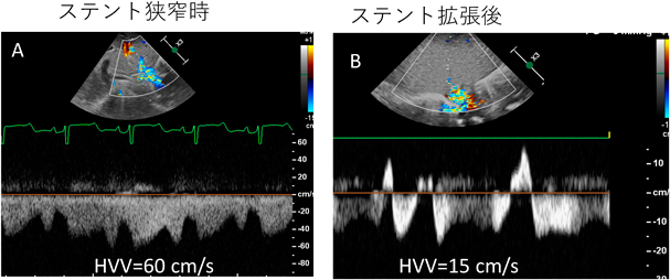 そこで我々は,新たな指標として,肺静脈が門脈に流入するタイプのTAPVR下心臓型(Darling分類III型)の低出体重児に対して経皮的静脈管ステント留置術後にステントのColor Doppler幅に加えて,経時的なPulse Doppler法で肝静脈の血流速度を計測し静脈管ステント狭窄を評価することとした.肝静脈血流速度でステント狭窄を評価して適切なタイミングで経皮的再狭窄解除を行い,体重が十分に増加した後にTAPVR修復術を施行した症例を経験した.今回この症例を経験し,肝静脈血流速度がステント狭窄を間接的に知る新たな指標であることが示唆された(Fig. 1).