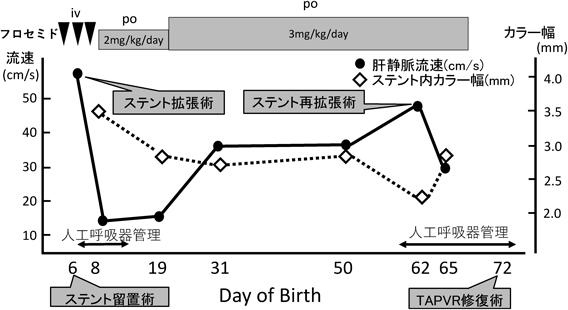 低出生体重であり肺静脈還流修復術を行うまで長期間の体重増加を目標とする必要があったため,再度ステント狭窄が起こる可能性を考慮してステント内のColor Doppler幅に加えて肝静脈血流をステント狭窄の評価として使用することとした.