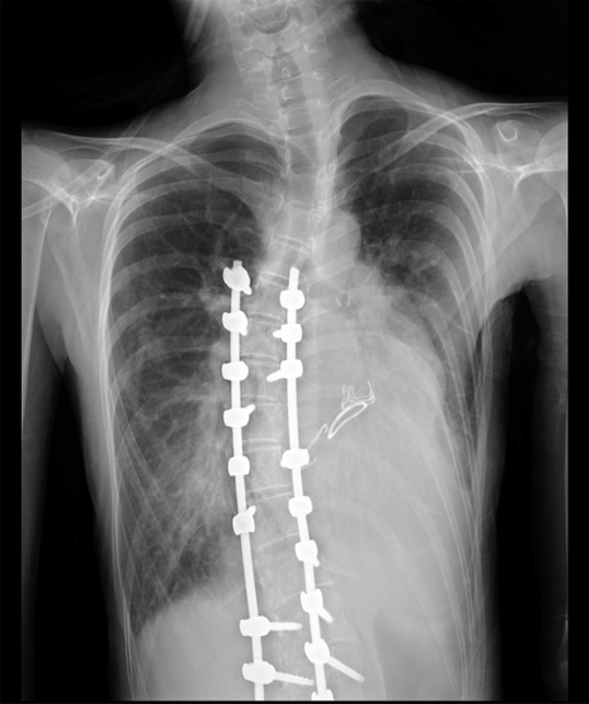 心胸郭比63%,肺血管陰影増強と側弯を認めた(Fig. 1).