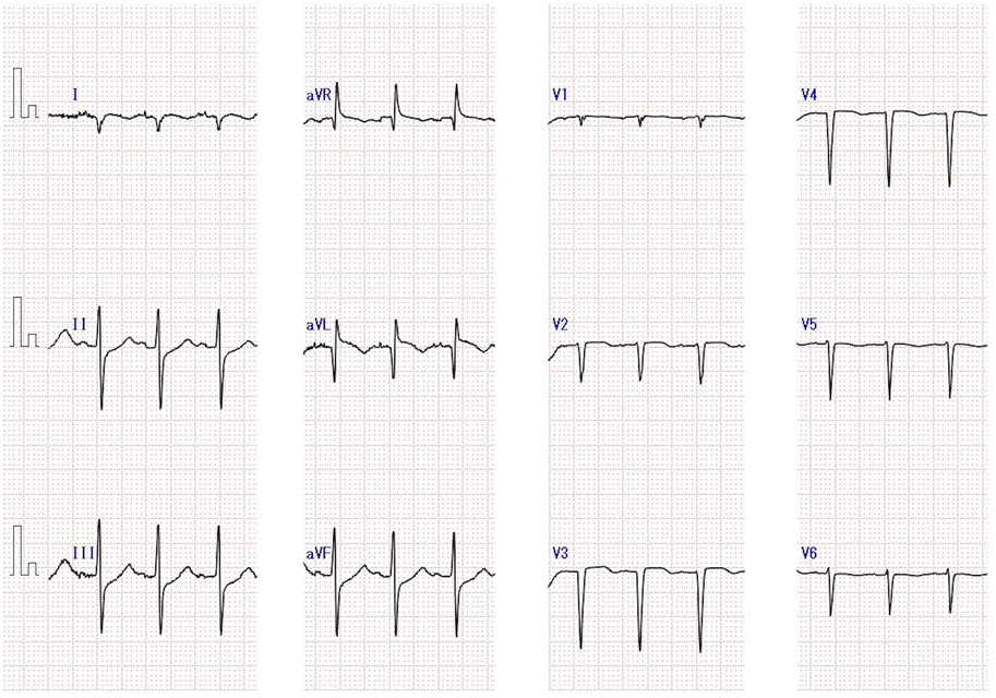 洞調律,心拍数127回/分,軸−120度,時計方向回転,V2~V4誘導でST上昇,V5・V6誘導で陰性T波を認める.左室肥大は認めなかった(Fig. 2).