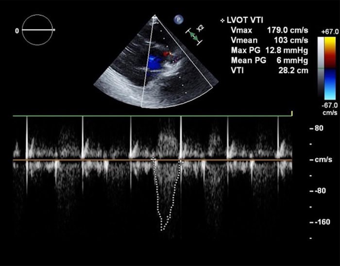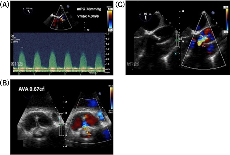 心電図のST-T変化とトロポニンT上昇を認めていたことから急性心筋炎の可能性も考慮し,小児集中治療室へ入室となった.低血圧やST-T変化が持続していたため,経口挿管と全身麻酔の上,経食道心臓超音波検査(transesophageal echocardiography: TEE)と心臓カテーテル検査を実施した.TEEでは,収縮期血圧50~70 mmHgの条件下で,大動脈弁平均圧較差は73 mmHg,大動脈弁最大血流速度4.3 m/sec,大動脈弁開口面積は0.67 cm2と重症大動脈弁狭窄の所見であった(Fig. 4).心臓カテーテル検査では,大動脈圧75/59(平均64)mmHg,肺動脈圧64/39(50)mmHg,肺毛細血管楔入圧38 mmHg,右室圧62/9(拡張末期圧13)mmHgであった.再度の大動脈弁基部置換術を要すると判断し,手術可能な施設に転院した.