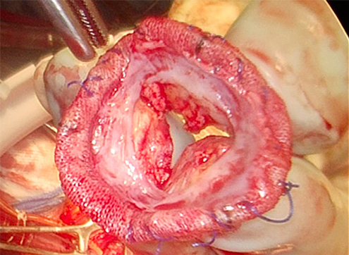 転院後より急激に循環不全が進行し,静脈脱血–動脈送血(VA)–体外式膜型人工肺(ECMO)導入を行った.同院でのTEEでは,構造的弁劣化による重症大動脈弁狭窄,生体弁周囲逆流を認めた.転院翌日に21 mm生体弁での大動脈基部置換術を施行した.術中所見として,生体弁は人工血管に直接縫合されており,生体弁と人工血管の縫合部の1/3周が破綻し,高度石灰化も認めた(Fig. 5).病理検査では高度石灰化を伴って線維化しており,培養は陰性であった.人工心肺からの離脱は困難であり,左室ベントを加えたECMO下に開胸帰室となった.
