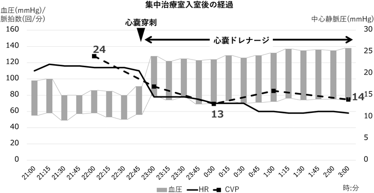 受診の21日前から全身倦怠感を認めていた.5日前に腹痛があり,4日前に嘔気を認め受診し,胃腸炎の診断で経過観察された.入院日,1分以内の全身性強直発作を認めたため前医へ救急搬送された際に,持続性の胃腸炎症状の鑑別を行う目的で心臓超音波検査を行われたところ,多量の心嚢液貯留を認めたため当院へ搬送となり,集中治療室へ入院した.