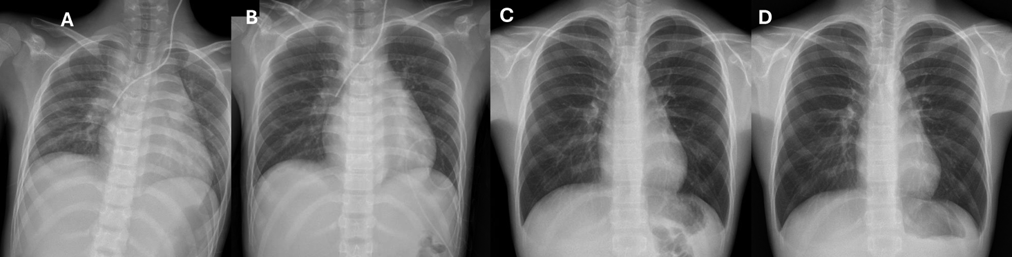 入院時の血液検査で代謝性アシドーシスを認めた.D-dimerは10.2 µg/mLと高値,CK-MBは3.0 ng/dLと軽度高値,トロポニンIは299 pg/mLで高値,BNPは374 pg/mLに上昇していた.ASO,リウマチ因子,甲状腺刺激ホルモンに異常を認めなかった.感染症検査として,多項目ポリメラーゼ連鎖反応(polymerase chain reaction: PCR)パネル検査を行ったがいずれも陰性だった.βDグルカンや結核菌特異的インターフェロンγ検査は陰性,その他提出していた血液学的検査で,CoxA2-IgG抗体と,CoxA9-IgG抗体が32倍(NT法)と後日判明した.胸部X線写真では心胸郭比(cardiothoracic ratio: CTR)59%と心拡大および肺うっ血像を認めた(Fig. 1A).心電図検査では,VSD術後から認めていた完全右脚ブロック波形を認め,全体的にやや低電位だったが,過去の心電図と比較してST部分の変化は認めなかった(Fig. 1B).心臓超音波検査では心臓前面に4 cm程度の心嚢水貯留を認め,右室は圧排されていた(Fig. 1C, D).