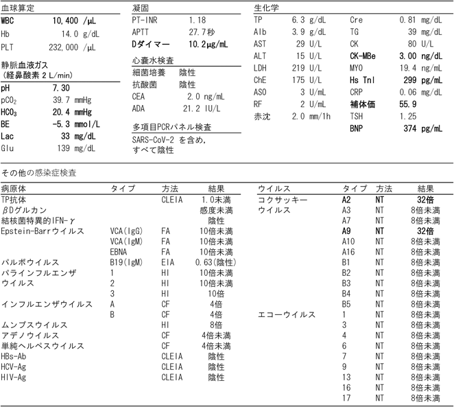 | 夜間の入院であり,各種抗体価は入院翌日の血清で検査.ADA:アデノシンデアミナーゼ,CF:補体結合反応,CLEIA:化学発光酵素免疫測定法,EIA:酵素抗体法,FA:蛍光抗体法,HI:赤血球凝集抑制法,HsTnI:高感度トロポニンI,MYO:ミオグロビン,NT:中和反応. |