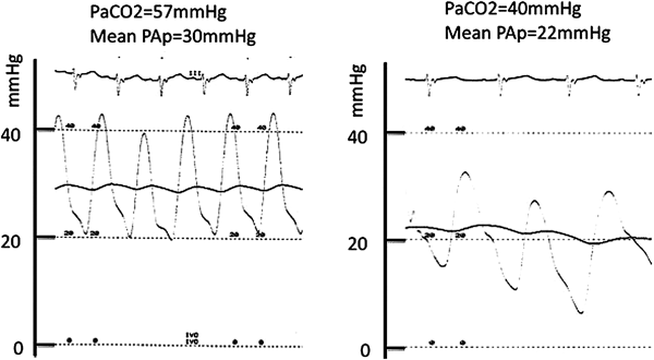 肺静脈楔入圧は肺動脈圧の代わりに用いることができるが,平均圧で18~20 mmHg以下の肺高血圧がない症例に限る9).また肺動脈圧の評価として平均圧25 mmHg以上あれば肺高血圧10,11)と診断する.後に述べる肺血管抵抗が種々の要因で変化するため,麻酔下で圧測定することの多い小児では,PH,PaCO2が生理的な状態で測定する.鎮静下では呼吸抑制され,肺胞低換気であることはしばしば経験する.必要があれば気管内挿管は躊躇しない.図に同一症例でのPaCO2が35 mmHgと50 mmHgでの平均肺動脈圧を示したが,8 mmHgも変化することがわかる(Fig. 1).この差が後述する肺血管抵抗(Rp)の計算に大きく影響する.