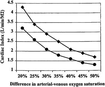 | * It is assumed that blood hemoglobin concentration is 14.7 g/100-mL, systeimc arterial and pulmonary venous oxgen saturation are equal at 98% and oxgen consuption is 125 mL/min per m2. |