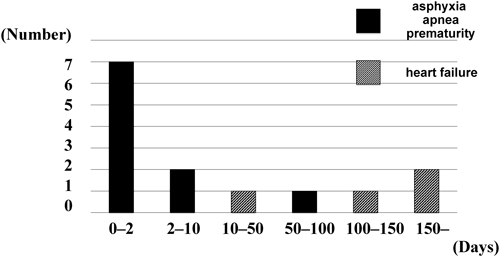 一方,A群のうち4例(症例2~5)は,退院できず生後57~219日(平均126日)で死亡した.いずれも消化管や呼吸器の合併疾患を有していた.これら4例では心疾患の姑息術により,心不全症状の改善は得られたものの,最終的には呼吸不全,消化管穿孔や敗血症など心疾患以外の原因で死亡している.症例4は左横隔膜弛緩症+肺低形成合併例,症例10は極端な小顎+四肢拘縮合併例で,いずれも呼吸不全で死亡した.症例6はA型食道閉鎖+低位鎖肛合併例で消化管穿孔から敗血症で死亡した.症例12はC型食道閉鎖+横隔膜ヘルニア合併例で,日齢1に気管食道瘻結紮術,胃瘻増設術,横隔膜ヘルニア修復術が実施されたが,消化管穿孔を合併し,最終的には呼吸不全で死亡した(Table 1).