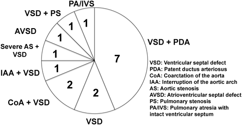 | GW: Gestational week, BW: Birth weight, CHD: Congenital heart defects, HOT: Home oxygen therapy. VSD: Ventricular septal defect, PDA: Patent ductus arteriosus, CoA: Coarctation of the aorta, IAA: Interruption of the aortic arch, AS: Aortic stenosis, AVSD: Atrioventricular septal defect, PS: Pulmonary stenosis, PA/IVS: Pulmonary atresia with intact ventricular septum, PAB: Pulmonary artery banding, bil-PAB: Bilateral pulmonary artery banding, rt-m-BT: right modified Blalock-Taussig shunt, ICR: intracardiac repair, →: Staged operation, d: days, m: months, y: years, *: Mosaicism. |