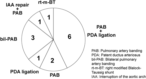 A群14例の手術時日齢は2~167日(平均32日,中央値25日),手術時体重は1,050~3,300 g(平均1,805 g)であった.心疾患の手術直前で人工呼吸管理を要していたのは14例中9例(64%)であった.(Table 1)手術術式の内訳をFigure 3に示す.全例姑息手術である.肺動脈絞扼術+動脈管結紮術6例,肺動脈絞扼術2例,動脈管結紮術が1例でこれらを合計すると全体の64%を占める.次いで両側肺動脈絞扼術が3例,大動脈弓再建+肺動脈絞扼術1例,修正Blalock–Taussig短絡術1例であった.なお体循環が動脈管に依存する左心系狭窄病変において両側肺動脈絞扼術を行う際には,動脈管がprostaglandin製剤を使用しない状態でも安定して開存していることを確認のうえ,手術を行った.3例とも術後も動脈管の閉鎖傾向はなく,prostaglandin製剤の投与を必要としなかった.A群14例で周術期死亡はなかった.