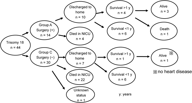 18トリソミーでは生存期間の中央値は10~14.5日,1年生存率は5~10%とその生命予後は不良であり,従来は積極的な治療は行われてこなかった.また先天性心疾患を高率に合併するが,主たる死因は心疾患ではなく中枢性無呼吸であり,心臓手術は生命予後を改善しないであろうとされてきた1–3).本邦でもいわゆる仁志田らのクラス分け(新生児医療における倫理的観点からの意思決定)において,18トリソミーはクラスCに分類され,現在行っている以上の治療を行わず,一般養護に徹するとする考え方が主流であった4).しかし18トリソミーの出生後の経過には個人差があり,稀ながら長期生存の報告もある5–8).近年は18トリソミーという病名での画一的な対応ではなく,個々の症例に応じた対応が求められつつある.田村らは「重篤な疾患を持つ新生児の家族と医療スタッフの話し合いのガイドライン」を提唱し,近年は看取りの医療から児の状況に合わせた最善の治療を提供すべく,両親と話し合って方針を決定する考え方が広がりつつある9).AHAの新生児蘇生のガイドラインでも18トリソミーは蘇生を差し控える対象から除外されている10).18トリソミーに対して生存率や在宅移行率の向上を念頭に,気管内挿管による蘇生を含めた集中治療を行った報告が散見される11–13).Koshoらは18トリソミー24例に対して帝王切開(67%),気管内挿管による蘇生(63%),心疾患を除く外科手術(42%)を含む集中治療を行い,1ヶ月の生存率が83%に上昇し生存退院が21%であったと報告している.しかし,この報告では心疾患の手術は行われておらず,死亡に関連した因子は心疾患が96%であったとされている11).以上のような経過を踏まえ,18トリソミーの心疾患に対する手術介入の報告も散見されるようになり,心不全症状の改善や在宅移行率の向上が報告されている14–20).Grahamらは18トリソミー24例,13トリソミー11例に対し,心内修復術21例,姑息術後心内修復術4例,姑息術10例を行い,生存退院が91%であったと報告し,心内修復術を中心にした心疾患への手術介入の有効性を述べている.また術前の人工換気日数2日以下が退院時の人工換気不要と関連があったと報告している14).Kanekoらは18トリソミー17例に対し,心内修復術3例,姑息術後心内修復術4例,姑息術10例を行い,手術死亡は1例のみで生存退院が82%であったと報告している.術後平均生存日数179日で心不全死は1例のみで,感染症が死因の最多(44%)となり,心疾患への手術介入は心不全死を予防するのに有効であると結論している.また,1歳以上生存はすべて初回が姑息術であったこと,退院後の死因は心不全が1例のみで,姑息術の効果を述べている17).本邦の多施設共同研究では,先天性心疾患を合併した18トリソミー127例中34例(27%)に手術介入が行われている.手術の内訳は姑息術23例(68%),開心術は6例(18%)のみで,不明が5例であった.手術後1ヶ月以内の死亡は2例のみであった.19例(56%)が生存し,手術群は非手術群に比べ明らかに生存率が高かったと報告している.手術例には,心疾患および心外合併症が比較的軽度で,元来予後良好な例が多く集積されている可能性が考えられ,心臓手術が長期的な生命予後を改善するかは不明であるが,心外合併症が比較的軽度で全身状態が良好な例では心臓手術が考慮されうるとしている18).Muneuchiらは心疾患への手術介入により,生存率の改善は得られたが,在宅移行は生存者の55%にとどまり,人工呼吸管理を要する児などの在宅移行支援の問題を述べている20).