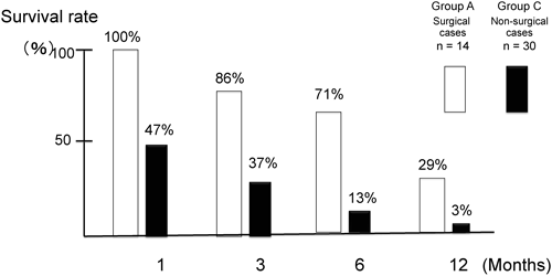 NICU入院例44例の経時的な生存率をFigure 5に示す.手術例(A群)では生後1,3,6,12ヶ月での生存率は100,86,71,29%であった.一方非手術例(C群)では生後1,3,6,12ヶ月での生存率は47,37,13,3%であった(Figure 5).生存期間の中央値は非手術例(C群)で24日に対し,手術例(A群)で234日であった.