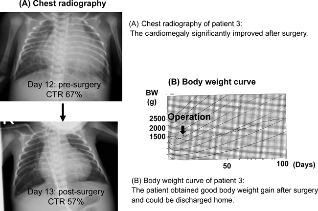 | 4 | 35 | 1462 | I | VSD+PDA | PAB+PDA ligation | 9d | (+) | (−) | Eventration of the left diaphragm, Hypoplasia of the lungs | (−) | | Death (219d) |