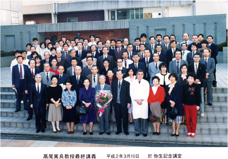多くの大学教授が,現役最後の年に“最終講義”を行う.写真は平成2年,今から23年前の故高尾教授の最終講義の後に東京女子医大の中庭で撮影されたものである.途中,教授は患者の名前を呼んだ時,「○○ちゃんは残念ながら……」と言葉を詰まらせしばし沈黙の時間が過ぎた.聴いていた私は,それほどまでに患者のことを思っていたのかと驚くのと同時に,教授が言葉を詰まらせるほどの素晴らしい患者だったのか,と改めて敬服する.