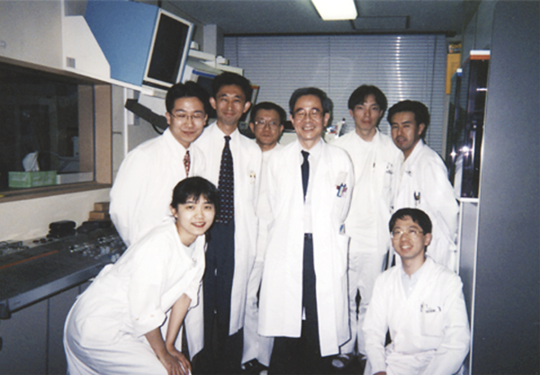 帰国後,旧国立小児病院循環器科で石澤先生と一緒に働かせていただきました.先生は,心臓カテーテル検査を直接されることはあまりなく,検査室の横のモニター室で画像を確認され,いろいろアドバイスをされることが多かったのですが,なかなか血管にカテーテルが入らない時などに「かしてごらん」とおっしゃり,一発で血管に導入され,「流石です」と拍手喝采の場面を鮮明に覚えています(写真1).