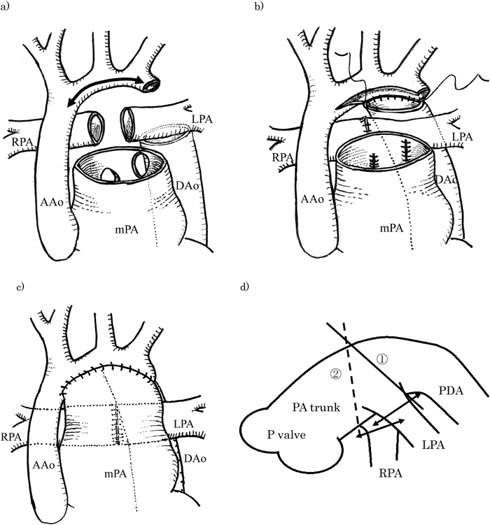 Norwood手術における大動脈再建では欧米では補填材料を使う方法が一般化しているが,本邦ではホモグラフト入手困難なために自己組織のみによる修復方法が主流である10–12).補填材料を用いる方法では左肺門部狭窄は少ないが,遠隔期での大動脈再狭窄が多いことが報告されている13).一方,自己大血管組織のみによる方法では左肺門部狭小による左肺動脈狭窄,左気管支狭窄が少なくないことが報告されており,38.9%で気管支軟化症,肺動脈狭窄に対して大動脈再形成術や肺動脈バルーン拡大術などの再治療を必要としていた4).当症例でのPATS法は自己大血管組織のみによる方法で,異物の不使用と成長性といった点から遠隔期での再狭窄のリスクは小さく,さらに左肺門部の狭窄を回避する方法であると考えられる.同方法の自験例5例でも,従来のNorwood手術(6例,自己心膜補填例を含む)と比較して上行大動脈と下行大動脈間距離/体重(mm/kg)が2.76±0.73 : 1.51±0.27(p=0.003)と有意に大きく,左肺門部狭窄回避に有効であることが示唆されている.