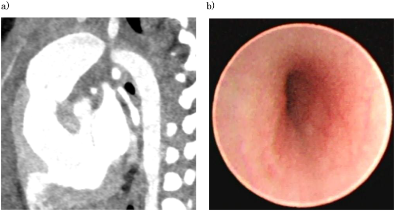 後方の下行大動脈からの圧排が軽減し,左気管支内腔の扁平化が50%以下に改善している(Fig. 3b).