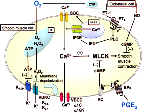 Modified and cited with the permissions of the authors from Reference 7). K+: potassium ion, Ca2+: calcium ion, O2: oxygen, O2-: superoxide anion, H2O2: hydrogen peroxide, ATP: adenosine triphosphate, KATP: ATP-dependent potassium channel, VDCK: voltage-dependent potassium channel, VDCC: voltage-dependent calcium channel, SOC: store-operated calcium channel, Mt: mitochondria, SR/ER: sarco/endoplasmic reticulum, IP3: inositol triphosphate, IP3R: IP3 receptor, PLC: phospholipase C, MLCK: myosin light chain kinase, CYP: cytochrome P450.