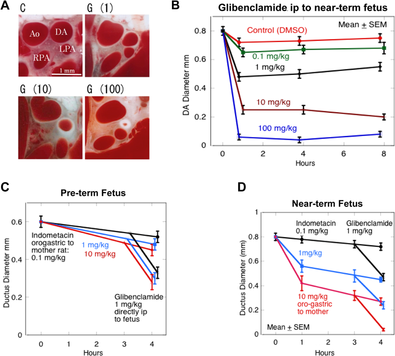 Since 1976, patent ductus arteriosus (DA) in the premature infants has been treated with cyclooxygenase inhibitors with some success. In 1993, Nakanishi discovered that DA strips in rabbit fetuses could be constricted with glibenclamide, an anti-diabetic sulfonylurea drug. In fetal rats with direct fetal administration and whole-body freezing, glibenclamide constricts the DA dose-dependently. In the near-term fetus, DA constriction is mild and the inner diameter was shortened up to 30% with 1 mg/kg glibenclamide (a clinical dose for children with diabetes with Kir 6.2 mutations). The fetal DA closes completely with 100 mg/kg glibenclamide. Following the administration of indomethacin, glibenclamide induced the same additional DA constriction in both near-term and preterm fetuses. In 1-day-old neonatal rats under maternal feeding, orogastric administration of large doses (up to 100 mg/kg) of glibenclamide induced hypoglycemia over 3 days with blood glucose levels of about 30 mg/dL. All of the neonates showed intact survival with good body weight gain and normal blood parameters. These findings suggest that glibenclamide at doses of 1 mg/kg and lhigher, with concomitant administration of glucose to prevent hypoglycemia, is useful for the closure of patent DA in the premature infants following unsuccessful treatment with indomethacin.
