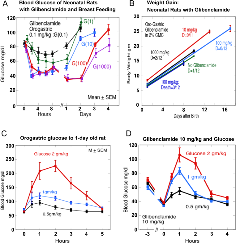 A: Hypoglycemia in 1-day-old neonatal rats with orogastric glibenclamide under maternal feeding. B: Mortality and weight gain in the neonatal rats with glibenclamide. Mortality is shown as the number of deaths the over the total. Death occurred within 24 h of glibenclamide administration. 1,000 mg/kg glibenclamide was given to 12 rats and 2 died. Ten survivors showed good weight gain. C and D: Glucose tolerance test in 1-day-old rats. Glucose water (5%, 10%, or 20%) was administered to 1-day old rats under maternal feeding. Rats with administration of glibenclamide at 3 h before showed smaller rises and rapid falls of blood glucose (D).