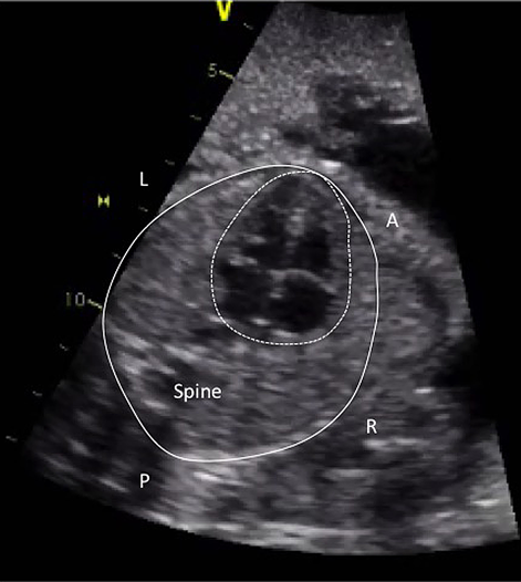 A four-chamber view of the fetal heart. The thoracic area is indicated by a solid line, and the cardiac area was by a dotted line. (A: anterior, L: left, R: right, P: posterior)