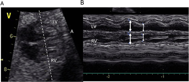 A: A four-chamber view of the fetal heart. The cursor was set perpendicular to the ventricular septum. B: M-mode of Figure2-A. Without an electrocardiogram, measurement is done at the widest dimension as diastolic one (thick arrows), and the shortest dimension as systole (arrows). (A: anterior, LV: left ventricle, RV: right ventricle)