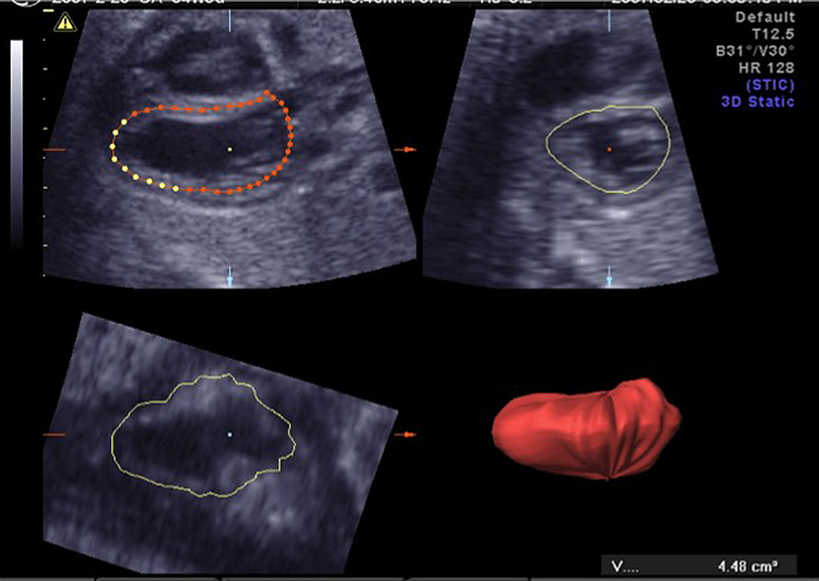 近年は3次元での解析も行われている.胎児心臓用に開発された4D超音波のspatiotemporal image correlation (STIC)法は,まず心臓全体をスキャンし画像を取り込み,心臓の周期的な変化から胎児の心拍数を検出する.読み取った心周期に合わせて3次元画像を合成し,3次元超音波画像を連続的に動かすことにより4次元超音波画像が得られる.その4次元画像を,解析ソフト(高精度体積計測機能:VOCAL)を用いて,設定した回転軸に沿って360度回転させながら,心内膜面のトレースをそれぞれの回転させた画面で行うことで,3次元での心室容積や収縮率,拍出量などの評価が可能である3)(Fig. 3).