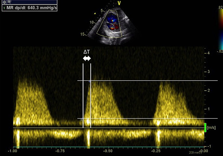 全収縮期にわたる三尖弁逆流が認められる場合には,連続波ドップラーによる逆流波形三尖弁逆流速度の立ち上がりの傾きから心機能を評価する(Fig. 4).心収縮能が保たれていれば収縮期早期に急峻に心内圧が上昇するのに対し,機能低下がある場合には圧の立ち上がりが鈍化する.三尖弁逆流血流速度が0.5 m/secから2.5 m/secまで上昇するのにかかる時間(ΔT)を計測する.三尖弁逆流速度が0.5 m/secから2.5 m/secまで逆流速度が上昇すると,簡易ベルヌーイの式を用いると推定右心室圧は24 mmHg上昇したと考えられ,24 mmHg/ΔTで圧の上昇率を評価する.800 mmHg/sec以下は低値である.400 mmHg/sec以下は重症な収縮能低下と考えられている8).
