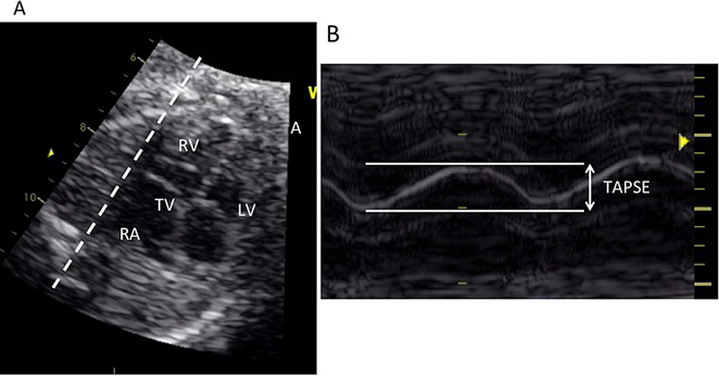 A: A four-chamber view of the fetal heart. The cursor was placed parallel to the ventricular septum. B: M-mode record of the TV annulus and the measured distance of the TV annulus excursion toward the RV apex. (A: anterior, LV: left ventricle, RA: right atrium, RV: right ventricle, TAPSE: tricuspid annular plane systolic excursion, TV: tricuspid valve)