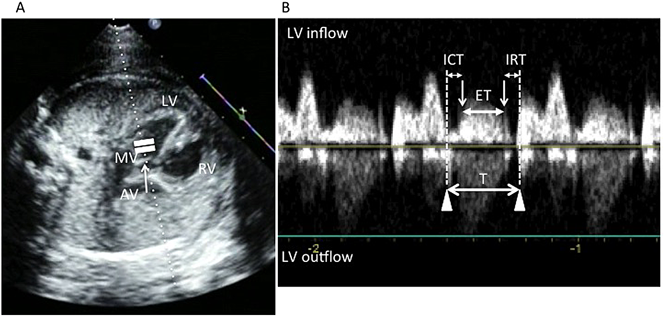 A: In the five-chamber view of the fetal heart that is obtained by sweeping the transducer from the level of the four-chamber view towards the fetal head, AV is observed; the cursor is placed just above MV and below AV. B: ET is the interval between the AV opening and closing (white arrows) or the onset and end of the aortic flow. T consists of ICT, ET, and IRT and is measured as the interval between the MV closure and opening, or the end and onset of the MV flow. (AV: aortic valve, ET: ejection time, ICT: isovolumetric contraction time, IRT: isovolumetric relaxation time, LV: left ventricle, MV: mitral valve)