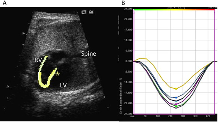 A: After tracing the surface of the endocardium, the software automatically calculate strain. B: Strain is often demonstrated by a strain curve. With the four-chamber view, the longitudinal strain of the basal, mid, and apical segments of both free wall and septum are measured. Each segmental strain curve is shown in Figure7-B. All segments contract spontaneously. (LV: left ventricle, RV: right ventricle)