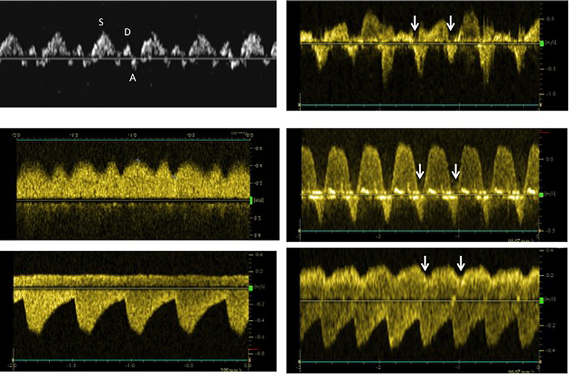 The upper, middle, and lower panels are the Doppler waveforms of the inferior vena cava, ductus venosus, and umbilical vein, respectively. Normal Doppler waveform of each vein (left), and the abnormal waveform with an increased reversed flow during atrial contraction (white arrows) in a fetus with tricuspid atresia (right). (S: S wave at systole, D: D wade at diastole, A: A wave at atrial contraction)
