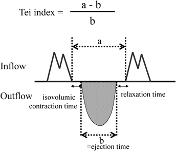 Tei indexは,パルスドップラーで得られた波形から,心室流入の終了から再開始までの時間(a)と心室駆出血流持続時間(駆出時間)(b)より,(a−b)/bとして算出される.(ICT+IRT)/ETと等しい(Fig. 1).収縮能低下でも拡張能低下でもいずれもTei indexの増大として反映され,総合的な心機能を表す指標として利用されている.また,時間分解能に優れたパルスドップラーを利用するため,心拍数の早い小児においても有用とされている8).産科領域において,胎児Tei indexは近年,双胎間輸血症候群(TTTS),子宮内発育遅延(FGR)の評価のために利用されることが多い9, 10).