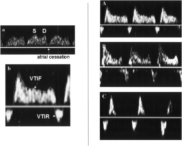 HLHSは出生後,血行動態的にFO開存が不可欠な疾患であるため,胎児心エコーにおいても従来はFOの形態を直接評価していた.一方で,Taketazuらは2004年に,FO自体でなく肺静脈血流パターンの評価の方が生後の状態をよく反映することを報告した33).具体的には胎児HLHS 40例において,肺静脈血流速度信号の面積(=Velocity Time Integral(VTI))を計測し,その逆行性血流と順行性血流の比(VTIR/VTIF)が0.18未満(A),0.18以上(B),拡張早期順行性血流のないto-and-froパターン(C)の3パターンに分類した(Fig. 5).その結果,生後BではAより卵円孔が有意に小さく,Cは全例卵円孔閉鎖しており生直後に緊急処置を要し予後不良であったと述べている.その後,2005年にMichelfelderらが胎児HLHS 41例をまとめた報告では,肺静脈血流パターンはもっと多様であるとしているが,やはり肺静脈血流により生後緊急BAS(Balloon atrio-septostomy)の必要性が予測できたとしている35).2008年にChintalaらも胎児HLHS(FO狭小化のない)27例と正常胎児66例の肺静脈血流パターンを比較して,FO狭小化がなくてもHLHSにおいては肺静脈血流パターンが異なっていることを報告している36).いずれの報告もHLHSにおいては肺静脈血流パターンの確認が重要であると結論している.