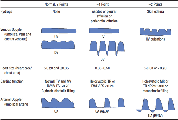 | Cardiovascular profile score is 10 if there are no abnormal signs and reflects 2 points for each of 5 categories: hydrops, venous Doppler, heart size, cardiac function, and arterial Doppler. AEDV indicates absent end-siastolic velocity; dP/dt, charge in pressure over time of tricuspid regurgitant jet; DV, ductus venosus; FS, ventricular fractional shortening; LV, left ventricle; MR, mitral valve regurgitation; MV, mitral valve; REDV, reversed end-diastolic velocity; RV, right ventricle; TR, trisucpid valve regurgitation; TV, tricuspid valve; UA, umbilical artery; and UV, umbilical vein. Reproduced with permission from the reference 16). |